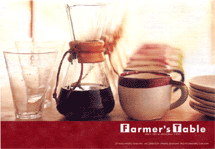 ファーマーズテーブルはスタイリストだった妻・博子が企画し始めた生活雑貨の店です。僕は女房役(?)で手伝ってきました。開店当時から使っているカードの文章を引用してみましょう。『生活まわりの雑貨たちは、ウチでいっしょに暮らすものたちだから、気どったものやとんがったものより、気さくでやさしいものたちがいいわ。そんなことを妻がいいだして、夫が賛成しました。好きな人と、好きなものたちに囲まれて、ゆったりと暮らす。「ウチはやっぱりいいなぁ」と、いいたいものですね。妻はスタイリスト、夫はグラフィックデザイナー。すてきなものを見つけてきたり、気に入ったものを作ったり。ファーマーズテーブルは、そんな夫婦と仲間たちのつくるブランドです。新しい物、古い物、日本の物、外国の物、見つけてきた物、作った物。みんな「ゆったり、楽しい生活」のための雑貨たちなんです。』・・・こんな感じで始めて、もうじき20年が立ちます。20代だった博子も40代になり、途中でニューヨークで暮らしたり、子供が生まれたり、ファーマーズテーブルも二人といっしょに育ってきました。気に入っていた表参道の同潤会アパート(この場所で始めたから、今のファーマーズのトーンができたといっても過言ではないでしょう)も、再開発の話の決定した2000年の暮れ、引っ越しました。ラッキーな僕たち、前にもまして良い場所に移りました。雑貨店のほかにカフェまで併設しました。お店のくわしいことはファーマーズのサイトに跳んでいただくとして、女房役の僕の担当したファーマーズのグラフィックの一部を紹介します。