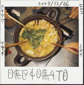 我が社の仕事おさめでした。大掃除をしました。なんせちらかっている事務所、モノであふれかえっているのです。なまじディテールにこだわってしまうと収拾が取れなくなってしまうので、適度に、表面にとっちらかっているモノを片付けて、チャンチャンとしました。それでもこの数年来、最高の仕上がりです。アキヤマのおかげです。マチダのおかげです。‥‥‥夕方から我が家で「おつかれさまーっ!」つうことでお鍋をしました。カキなど調達したので、お味噌仕立てにしました。ポラリは終盤、うどんを入れて‥‥「ちょっと待った!一枚撮るから。」
