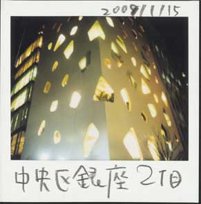 銀座にある、初めての、とある代理店から声がかかりました。僕らの仕事は120%の受注仕事、お声がかかるといそいそと出かけていきます。ま、お見合いみたいなものなのでしょう。夕方でした。プランタンの脇にラッキーにも空いているコインパーキングを見つけました。暖房のきいた車内から外に出ると「ひぇーっ!さみぃ〜!」って感じ、そうとうに冷え込んでいます。‥‥‥‥‥‥‥‥‥‥‥‥‥‥‥お見合いを終えて、その会社から出てくると、先ほどよりも寒く感じませんでした。きっとアドレナリンが体内をめぐっているせいでしょう。‥‥‥‥‥‥‥‥‥‥ポラリは「ミキモト銀座2」、あの伊東豊雄氏設計のビル、最近の彼のパターン(サーペンタイン・ギャラリー・パビリオンや、トッズ表参道店)窓割りがアートしていて楽しいじゃありませんか。このランダムな穴の開いた壁が立派な構造体、内部に柱は無いのだそうです。