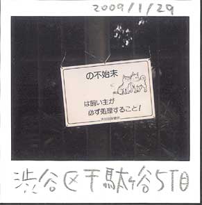 新宿御苑の脇にある友達の事務所を訪れました。その帰り、御苑の鉄柵に面白いプレートを見つけてしまいました。目的語が意図的に省かれているそれ、十分に目的をうながしています。若干こざかしい、言葉を変えるなら「クサイ」表現だと思いましたが、どう考えても意図は通じるのであります。犬猫のイラストと、「飼い主」という言葉がなかったらダメですけどね。‥‥‥それともだれかが(いたずらで)消したのかな?