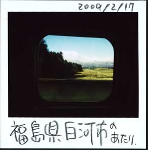 イシカワは、西に東に南に北に動き回っております。友人が「どさ回りか?」と、言いました。‥‥‥‥‥‥‥‥本日は福島へ、東北新幹線、朝8時36分東京発の「なすの252号」にのって新白河駅で降りました。郡山の一つ手前です。駅前からタクシーで3800円ほど走ったところに工業団地があって、その中に日本最大手の印刷会社の工場があります。(心の声:辺鄙なところにつくるなよ!)こちらに来たのは3度目(2007年11月9日と14日のポラリ参照)、その時クルマで来て懲りたのであります。「地面がつながっているなら何処へでもクルマで行くぜ!」と、いつも言い放っておる私ですが、寄る年波、軟弱になっているようです。‥‥‥‥タクシーの運転手が話してくれました。「昨日の夜、雪が降ったんすよ。暖かいんすね、すぐに溶けちゃって。」たしかに北側の日陰にはうっすら雪が残っていました。‥‥‥‥ポラリは帰りの新幹線、那須岳も真っ白ではなく、まだらでした。
