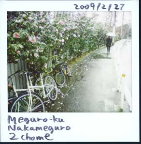 気候のはなし、先日どこかの地方自治体が「これはもう(温暖化)などという表現は適切ではない、我々は(高温化)と呼びます。」という報道を聴きいたばかりです。賛成でしたが‥‥‥‥‥‥ここのところ寒い日が続いています。今朝にいたっては雨に雪が混ざっているではないですか!「菜種梅雨」と言うには早いのだそうですが、梅雨のような前線が居座っていて、長いあいだ青空を拝んでおりません。‥‥‥‥‥健康保持のための朝のウォーキング、ヒロコは恵比寿駅まで、僕は中目黒駅まで歩くのであります。でも軟弱な夫婦は、今朝のようなみぞれの日には「クルマで出るか?」「うん!」と、なるのです。‥‥‥‥‥ヒロコを恵比寿駅に送る途中、防衛庁技術研究所の塀の前にピンクのサザンカが、けなげに咲いていたのでポラリってみました。花がまるで雪のようではないですか、そぼふるみぞれは写真には写りませんでしたが。