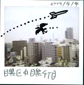 ポラリは(ゆるやかな)報道なので、今日は我が家より北東の空を撮ってみました。‥‥‥‥‥‥‥‥北朝鮮の、人工衛星打ち上げロケットとかミサイルとか言われているものが(ポラリ通信社ではない)報道機関で騒ぎになっています。午後12時すぎのことです。「先ほど発射されました!」の、ニュースを見て、急いで見えるはずのないあっちの方を撮った、ポラリ通信社でありました。ところがこのタイミング「見えるはずのない」の2乗だったのです。どういうことかと言うと、これ誤報だったのです。その後、(ポラリ通信社ではない)報道機関ではこの誤認知が話題になっているようです。(どちらにしても、こっちに向かってでも、どっちに向かってでも、発射やめてほしいです。)‥‥‥‥‥‥ま、ポラロイドそのものはつまらない画なので、マジックで「見えるはずのない」ものを描いてみたわけです。ロケットはイイとしてもうひとつは「そうそう、東京にはカラスがたくさん飛んでるもんな。」----チガっウ! 昨日逃げちゃった千葉の「アフリカハゲコウ」さんのつもりです。がんばってアフリカまで逃げ帰ればイイのにと、思っている私です。