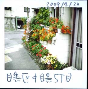 (知らない人の)おウチの前も花盛りです。‥‥‥‥‥‥‥こうして道行く人に向かって、ウチの前を花盛りにするのって、たいていお年寄りのいるウチです。ここのお宅もお婆さんがいらっしゃるようです。「あ〜ら、ヤマダさん、キレイね。」「ヨシダさん、これ増えたら株分けするから、お持ちなさいよ。」「あ〜らヤダ。私、すぐ枯らしちゃうのよ。ずぼらだから。こうしてヤマダさんとこのを見ているのがイイのよ。」なんて会話が聞こえて来そうです。