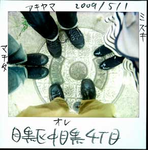 昼飯時のことです、我が社がカレンダー通りに働いていたら、娘がやって来ました。「あれっ?今日休みなの?」「開高記念日。」「明日は普通の土曜日だから学校なんだろ?」(ミズキの学校は土曜もあるのです。)「明日も休み。10月の休日の振りかえ。」な、なんと見事な連休対策がされた、サービスの良い(?)学校なのでありましょうか。(ひょっとすると嬉しいのは先生かも?)‥‥‥‥‥‥そんなわけで4人でランチに出ました。みんなで、マンホールの上で足をポラリってみました。なぜか、みんな黒いクツでした。‥‥‥‥‥‥明日から我が社も堂々の5連休です。(お婆さんは川に洗濯に、お爺さんは山に芝刈りに)アキヤマはどこぞにキャンプに、マチダは実家の沖縄に、我が家は(3日から)茨城に。