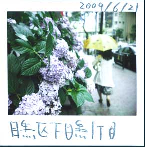 「週末は晴れ」って何日か前の天気予報で聞いたような気がしましたけれど、今日は立派な梅雨日、犬の散歩にも適しません。‥‥‥‥‥‥‥‥娘は出かけてしまったので、買いだし兼昼飯に女房と目黒の駅前まで出ました。‥‥‥‥‥‥‥‥権の助坂(目黒駅前の坂)で一枚ポラリ、アジサイ入れ込みの傘の女性はイケると思ったのです。そして、これは(しいてタイトルを付けるとしたら)雨の権の助坂だなと思いました。ふーむ。「雨の権の助坂」か、まるで演歌のタイトルだな、と思った次第です。ちょっと調べてみました。有りました!全然記憶にはないのですが、ビートきよしの歌にそれがあったのでした。(「雨の西麻布」っていうのは覚えていますが)‥‥‥‥かくして週末はくだなく過ぎて行きます。
