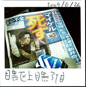 ポォーッ!‥‥‥‥マイケル・ジャクソンの急逝、ちょっと驚きました。今日のFMラジオは彼の曲ばっかり、(いまさらながら)名曲がたくさんあります。彼の唱法のバイブレーションというかグルウブ感、本当に独特、カッコイイです。特にファンとかいうのではありませんが、面白いと思っておりました。‥‥‥‥‥‥‥‥さてどのようにそのニュースをポラリに載せようか?考えたのであります。「ポラリ新聞社」はロスには飛べず、しょうがないので他の新聞社の(失敬)2次取材、それも本来なら号外ぐらいを手に入れたいものですが、新橋方面に出かけることもなかったので、いま(17時25分)東急中目黒駅の新聞スタンドに東スポを買いに行ったのでありました。そしてすぐに車の中で撮ったのです。臨場感あるでしょ?(もうひとつ時々やるのですが、夜のテレビを撮る手もあるのです。)‥‥‥‥‥‥‥‥ワールドツアーをひかえていたとか、やっぱり残念です。でも彼の歌声は永遠に残ってますから。