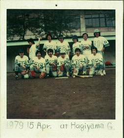 まる6年近く(ほとんど)毎日つづけて来た行為なので5コマほどクールダウンにお付き合いください。画面はポラリ以前のポラを乗せてみました。(画の説明は後でしましょう)2003年の11月の1日から始めた(サイト上の)ポラリ、「ほぼ毎日付ける」と、弱気で始めましたが、結局初めのうちの6日間を除いて、毎日立てつづけて来てしまいました。(ばかです。) 数えてみたら2107カットでした。‥‥‥‥●1979年4月の15日:(きっと土曜日なのでしょう。)当時30歳くらいだった僕たち、多摩美の同級生を中心に草野球のチームを作りました。2、3年でしょうか?ほとんど毎土曜日に試合をしていました。(練習のために集まった記憶はありません)ユニホームは(何故か)野球のものではなくアメフトのもの(人によっては、良いのか悪いのか)若干もっこりしました。チーム名は(確か)シルバースターズとかなんとか。そんなに強くはありませんでしたが、楽しかったであります。後列左から2番目が(なぜか首位打者を取ったことのある)僕です。場所は小平市の萩山グランド。